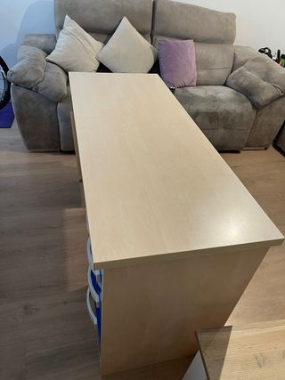 Escritorio espacioso con cajonera integrada. - Medidas: 130 cm de ancho, 55 cm de profundidad y 70 cm de alto. - Cajonera de color azul con tiradores blancos. -Hueco para ordenador y teclado.