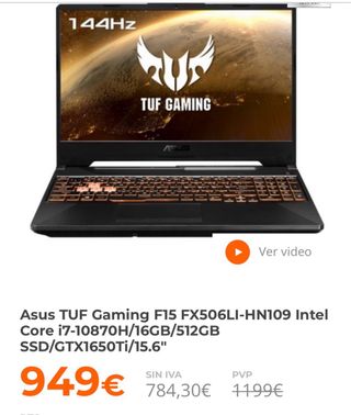 Portátil gaming Asus TUF F15. -Windows 11 instalado. -Procesador I5-11400H. -Tarjeta gráfica dedicada RTX 3500 TI. -16 GB de memoria RAM dual channel. -1 TB de almacenamiento SSD. -Pantalla 1080p a 144hz compatible con vrr y Nvidia G-Sync. Se vende por falta de uso. Perfecto para jugar, editar, ver contenido multimedia y multitarea. Se incluye un soporte para mejorar refrigeración y un cable usb-C a Display port para conectar a un monitor externo.