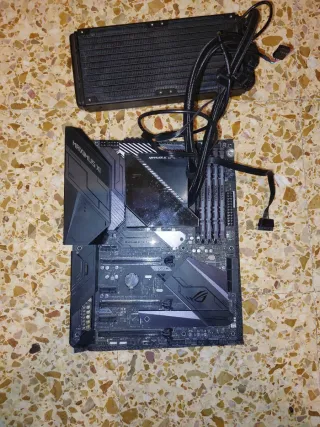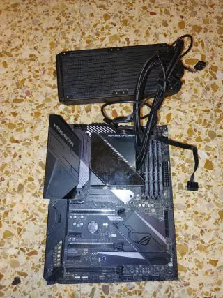 Conjunto de componentes de PC: - Placa base ASUS ROG Maximus Hero XI WiFi. - Procesador Intel Core i7-9700K. - 32GB de memoria RAM DDR4 2933 Mhz CL 15 (4 x 8GB). - Radiador Asus ROG Ryujin 240 sin ventiladores (con pantalla oled, pero con bastante burn in) También añado varios ventiladores (con leds rojos, tres transparentes con les en el hub y otro con un ring light) y una tira led rgb.