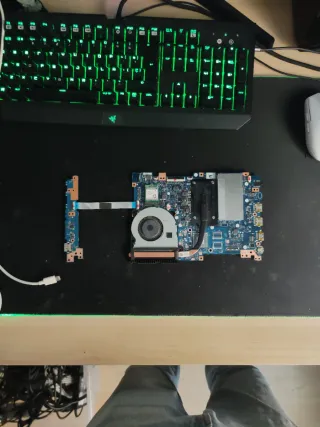 Placa base de portátil Asus. - Componente electrónico principal. - Incluye ventilador y disipador. - Conector de cinta visible. - No tengo se mas información sobre el pero funciona correctamente se probó con una pantalla está ok. Tiene memoria RAM integrada y un espacio para agregar otra extra. :v no regateos plox está barata funcional y por la pereza de volver a encenderlo para ver qué procesador tenia lo dejo a este precio xD