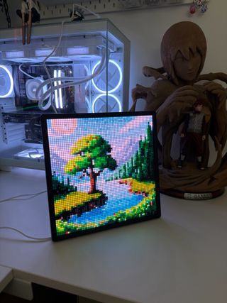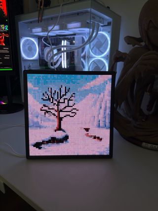 Pantalla decorativa con diseño de píxeles LED, ideal para añadir un toque artístico a tu espacio. Marca newstyle, se vende en shein y aliexpress - Diseño de paisaje con árbol y río. - Marco negro. Se controla con aplicacion movil
