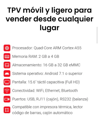 TPV móvil y ligero para vender desde cualquier lugar: NUEVO! Procesador: Quad-Core ARM Cortex-A55 Memoria RAM: 2 GB a 4 GB Almacenamiento: 16 GB a 32 GB eMMC Sistema operativo: Android 7.1 o superior Pantalla: 15.6" táctil capacitiva (FulI HD) Conectividad: WiFi, Ethernet, Bluetooth Puertos: USB, RJ11 (cajón), RS232(balanza) Compatible con impresora térmica, lector código de barras, cajón automático