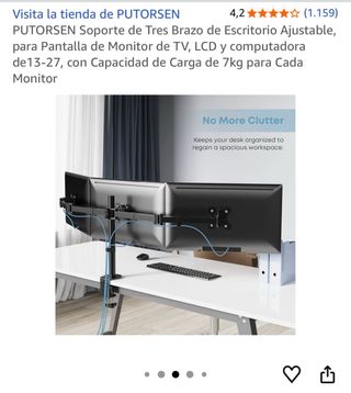 Soporte de escritorio ajustable para tres monitores. - Compatible con pantallas de TV, LCD y ordenador de 13 a 27 pulgadas. - Capacidad de carga de 7kg por monitor.