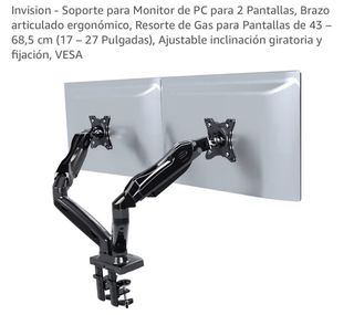 Soporte para Monitor de PC marca Invision para 2 Pantallas. Brazo articulado ergonómico, Resorte de Gas para Pantallas de 43 - 68,5cm (17 - 27 Pulgadas). Ajustable inclinación giratoria y fijación VESA. Capacidad de carga: 2kg a 6.5kg Solo un brazo nuevo cuesta 48€. 📦 Recogida en domicilio (Madrid) La persona compradora debe encargarse de la recogida. 📅 Pregunta disponibilidad Escríbeme indicando qué te interesa y cuándo podrías venir a recogerlo para coordinarlo fácilmente.