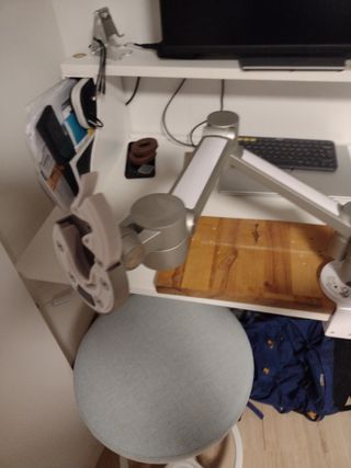 Soporte de pantalla doble para ordenador, en perfecto estado. Permite colocar dos pantallas. A parte regalo accesorios para poner el portátil, una tablet o documentos tal y como muestran las fotos Acero y aluminio. En perfecto estado con todos sus componentes y llaves.