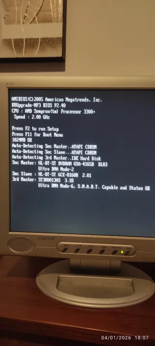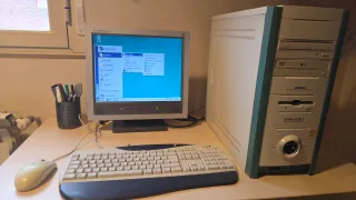 Ordenador PC antiguo, formato torre ATX, revisado y funcional, con Windows XP con licencia. Dispone de conexiones antiguas utiles para equipamiento legacy como puerto paralelo, serie, conectores ps/2, disquetera, puertos IDE, etc. Para uso retro también puedes ponerle Windows 98. Caracteristicas: - CPU AMD Athlon XP 2600+ "Barton" - 512MB RAM - Disco duro IDE 80GB Seagate - Disketera 3,5" 1.44MB alta densidad - Gráfica y audio integrados, puerto VGA , salidas y entradas jack 3,5", puerto joystick 15 pines clásico. - Unidad DVD IDE - En placa, puertos PCI y AGP - Puertos traseros USB, serie, paralelo, ps/2 Solo torre, sin pantalla. Ver fotos para mas detalles y estado. Aunque está probado y funciona, no se da ninguna garantía al ser material con 20 años de antigüedad. Hago descuentos si compras varios articulos de mi perfil. Recogida en mano preferiblemente, no se envía por sistema wallapop. Otras opciones de pago y envio, consultar.