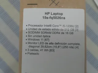 Ordenador portátil HP de 15 pulgadas en color plateado. - Diseño elegante y moderno. - Pantalla de 15 pulgadas. • Procesador Intel Core i5-1235U (12ª gen) – rápido, silencioso y eficiente. • 16 GB de RAM – multitarea sin bloqueos. • SSD 512 GB – arranque instantáneo y mucha capacidad. • Tarjeta gráfica Intel Iris Xe – ideal para trabajo gráfico ligero y multimedia. • Pantalla 15.6” Full HD – calidad de imagen nítida y cómoda. • Windows 11 instalado y listo para usar. tiene muy poco uso! está en perfecto estado.