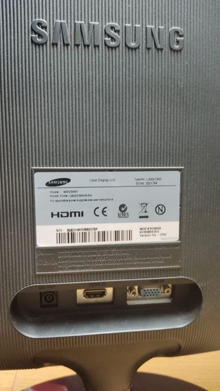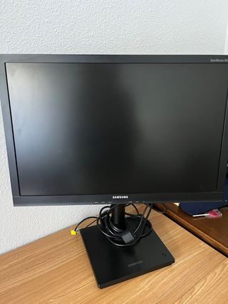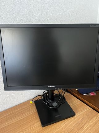 Monitor Samsung de 19 pulgadas en color negro. Es algo antiguo y tiene alguna marca en el plástico pero funciona perfectamente. Incluye cable a la corriente y un cable con adaptador a vga y HDMI La pantalla esta perfectamente