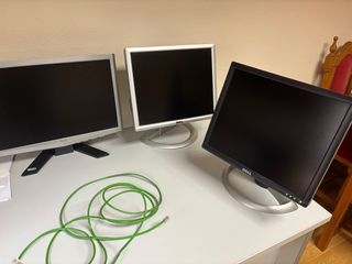 Conjunto de tres pantallas de ordenador, dos de la marca Dell y una de Acer. Ideales para ampliar tu espacio de trabajo o para un setup multi-monitor. - Pantalla Acer de 16 pulgadas. - Pantalla Dell de 14 pulgadas. - Pantalla Dell adicional.