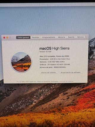Ordenador Apple iMac de 21.5 pulgadas, modelo de finales de 2009 Funcionando perfectamente aunque ya no recibe actualizaciones pero se puede actualizar de manera extraoficial con open core y seguir usando para todo sin problemas. Tiene instalado word, Excell y Power Point de windows. Tiene un pequeño golpe en la esquina superior izquierda de la pantalla. Se entrega con teclado y raton