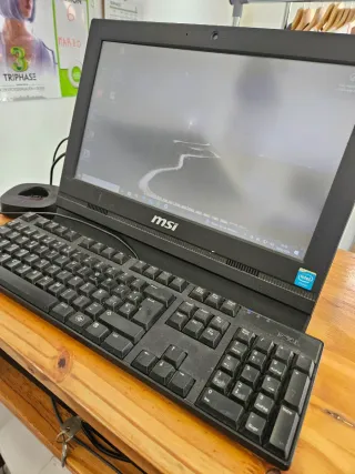 Ordenador All-in-One MSI en color negro, ideal para comercios. - Diseño compacto y elegante. - Pantalla de alta resolución. - Teclado completo incluido.