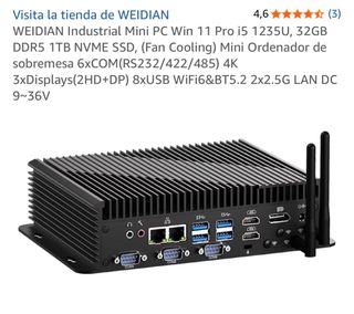 Mini PC WEIDIAN con procesador Intel i5 1235U y 32GB de RAM DDR5. - Almacenamiento NVME SSD de 1TB. - Refrigeración por ventilador (Fan Cooling). - Sistema operativo Windows 11 Pro. - Múltiples puertos COM (RS232/422/485). - Soporta hasta 3 pantallas (2x HD + DP). - 8 puertos USB. - Conectividad WiFi 6 y Bluetooth 5.2. - Doble puerto LAN de 2.5G. - Admite alimentación DC de 9~36V.