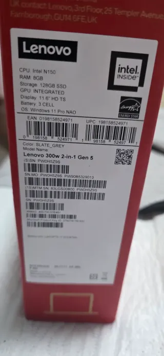 Ordenador portátil Lenovo 300w 2-en-1 Gen 5 en color gris, a estrenar. - Procesador Intel N150. - 8GB de RAM. - Almacenamiento SSD de 128GB. - Pantalla HD de 11.6 pulgadas. - Batería de 3 celdas. - Sistema operativo Windows 11 Pro NAO.
