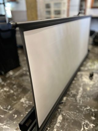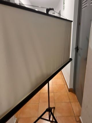 Pantalla de proyección formato 16:9 prácticamente sin usar. Es una pantalla ultramovil para la proyección frontal. La carcasa mide 174 cm de largo por 12 cm de ancho. La pantalla mide de largo 150 cm y de alto 85. 69 pulgadas Si se quiere comprar con proyector, consultar el anuncio del conjunto. La marca asignada no es la correcta.
