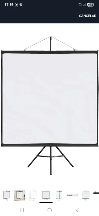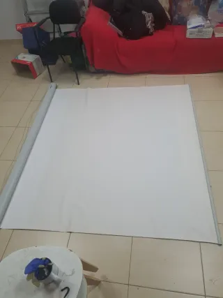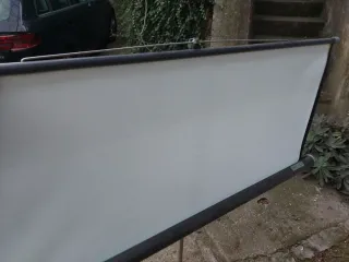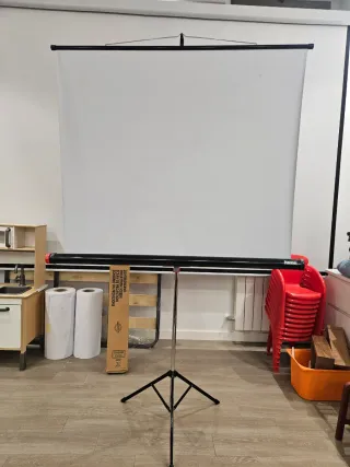 Pantalla de la marca Celexon, model Economy, de color blanc, de 211 x 160 cm. La pantalla es enrollable i tota la estructura es pot plegar. Es va comprar el 2024 i practicament no se li ha donat us.