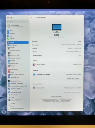 Cómo nuevo, funcionamiento perfecto. Sin golpes ni arañazos. Pantalla impoluta. - Pantalla Retina 4k de 16:9 - Intel Core i3 de 3.6GHz - 8 GB Memoria RAM 2400 Mhz DDR4 - Almacenamiento Fusión Drive 1Tb - Cámara Face Time HD - Radeon Pro 555X 2GB Incluyo teclado USB y ratón inalámbrico. Se escuchan ofertas razonables