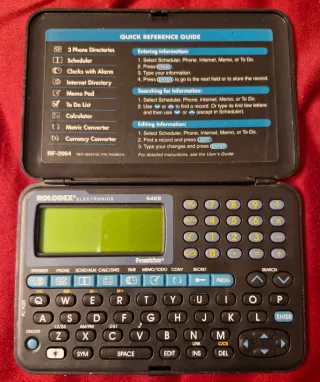 Agenda electrónica Rolodex Electronics RF-2064 VINTAGE. Capacidad de memoria: Posee una memoria interna de 64 KB para almacenar datos. Funciones principales: Incluye directorios telefónicos, agenda, bloc de notas, lista de tareas, calculadora, conversor métrico y conversor de moneda. Características físicas: Cuenta con una pantalla monocromática, un teclado QWERTY completo y botones de acceso directo a funciones en color azul. Conectividad: Dispone de un puerto para PC ("PC Port") y función de enlace ("Link") para sincronización de datos. - Conexión PC PORT. Pilas no incluidas