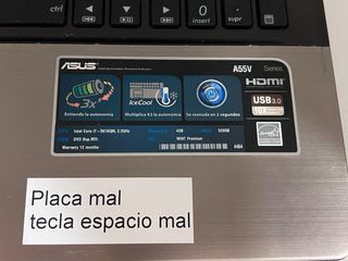 ASUS A55V. Procesador: Intel Core i7-3610QM a 2.3GHz. Memoria RAM: 4GB. Sin disco duro, la pantalla está perfecta y el resto de componentes tambien salvo placa base y la tecla de espacio falla. Sistema Operativo: Windows 7 Premium. Estado: Incluye una nota que indica fallos en la placa base y en la tecla espaciadora.