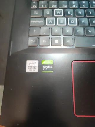 Portátil gaming Acer Nitro 5 en color negro. Diseñado para una experiencia de juego inmersiva. - Procesador Core I5 de 8va generacion - 8Gb de memoria RAM - 256Gb de memoria interna - Tarjeta grafica Nvidia Geforce GTX - Pantalla Full HD 1080p. - Teclado retroiluminado en rojo. - Cubierta con acabado de fibra de carbono. Tiene una marca de mancha en la parte de la cubierta tal y como se evidencia en las fotos pero nada que afecte su funcionamiento, se vende por falta de uso, economico.