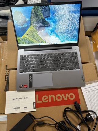 Portátil Lenovo con acabado plateado y teclado negro. - Pantalla de 15 pulgadas. - Teclado numérico integrado. - Diseño moderno y ligero. Solo se ha usado 1 año, pero funciona a la perfeccion y muy rapido