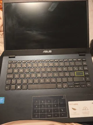 Portátil Asus en color negro y gris. Diseñado para ser ligero y fácil de transportar. - Pantalla con apertura de 180 grados. - Teclado numérico integrado en el touchpad.