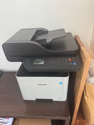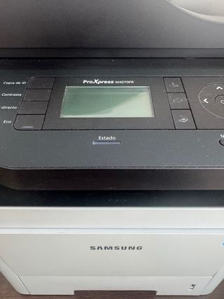 Impresora multifunción Samsung ProXpress M4070FR en color blanco. - Escáner integrado. - Función de fax. - Bandeja de papel. - Panel de control con pantalla. -Bisagra rota parte derecha por imprimir pero funcióna