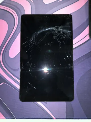 Tablet Samsung Galaxy Tab A en color negro. La pantalla presenta daños visibles. - Pantalla agrietada. - La tablet funciona. - No se puede cargar, indica advertencia de puerto húmedo. - Reiniciada de fábrica. - Puerto con desgaste visible (2nda imagen). - Abolladura en la 4ta imagen, no afecta a nada.