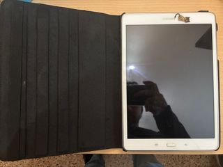 Tablet Samsung Galaxy Tab A en color blanco. Incluye funda protectora. Más detalles en fotos. Tengo factura por si hiciera falta enseñarla. - Pantalla de 10.1 pulgadas. - Funda negra con diseño de pliegues.