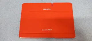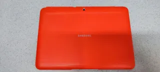 Funda para tablet Samsung Galaxy Tab 2 en color naranja. - Diseño elegante y protector. - Acceso a todos los puertos y botones. - La tablet enciende pero no Carga - El estado es muy bueno salvo una raya en la pantalla frontal, se ve en fotografia