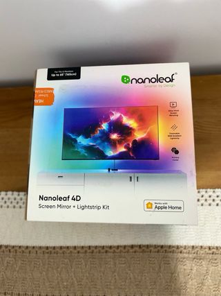 Kit de pantalla Nanoleaf 4D con espejo y tira de luces. - Para TVs y monitores de hasta 65 (165cm). - Espejo de pantalla ultra-vívido. - Tira de luces LED RGB degradadas y recortables. - Incluye cubierta de privacidad. - Compatible con Apple Home.