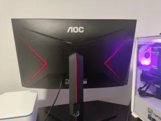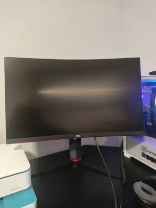 Monitor curvo de 27 pulgadas AOC negro y rojo. - Pantalla de 27 pulgadas curva - Altavoces integrados - 165Hz de refresco -Resolucion 1080p -Tiene una muesca en la peana, se ve en la foto. No bajo precio. El monitor funciona perfectamente.