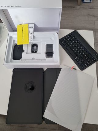 Tablet de 12. Incluye funda, teclado (se carga por usb), ratón (a pilas) y puntero, además de protector de pantalla de cristal. Completamente nueva, unicamente abierta para verificar que funciona correctamente, 10 minutos de uso. - 8GB de RAM ampliables a 36 de manera virtual - 128GB de almacenamiento interno, ampliables con tarjeta de memoria - Conectividad 4G LTE.