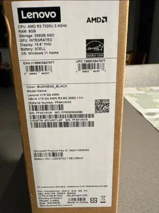 Portátil Lenovo V15 G4 AMN nuevo a estrenar, en su caja sin abrir con precinto de fábrica. - Procesador AMD R3 (Ryzen 3) 7320U - Memoria RAM 8GB - Disco duro SSD 256GB - Windows 11 - Pantalla 15,6" FHD Precio en tienda Mediamarkt 429€