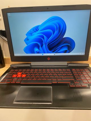 Portátil gaming HP Omen 15 con un diseño llamativo. - Pantalla de 15 pulgadas. - Teclado retroiluminado en rojo. - Acabado en negro con detalles rojos. - Ventilador nuevo - Bateria nueva - Con cargador