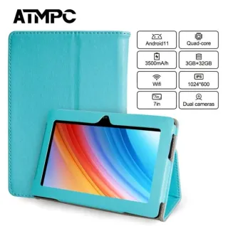 Tablet ATMPC en color azul, ideal para uso diario. Incluye funda protectora. - Sistema operativo Android 11. - Pantalla IPS de 7 pulgadas con resolución 1024*600. - Procesador Quad-core. - Memoria RAM de 3GB y almacenamiento de 32GB. - Batería de 3500mAh. - Conectividad Wifi. - Doble cámara.