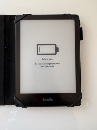 Dispositivo de lectura Kindle en color negro. La pantalla muestra un icono de batería baja. - Pantalla de tinta electrónica. - Diseño compacto y ligero. el primero el conector de cargo se metió para adentro y el segundo la pantalla