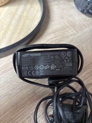 Adaptador de corriente para pantallas Samsung. Incluye cable de alimentación. - Color negro. - Conector de salida circular.