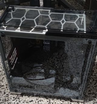 Ordenador de sobremesa con procesador Intel i7 de cuarta generación y tarjeta gráfica GTX 1070. - 32GB de memoria RAM DDR3. - Unidad de almacenamiento SSD. - (!!) PLACA BASE NO FUNCIONA, NECESITA REEMPLAZAMIENTO (~25-50eur) (En la foto esta abierto el lado pero no lo es normalmente)