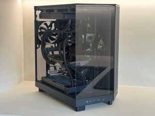 Caja para ordenador de sobremesa con un diseño moderno y elegante. - Panel frontal con rejilla para ventilación. - Logo de Intel Core i7 visible. - Acabado en color negro.