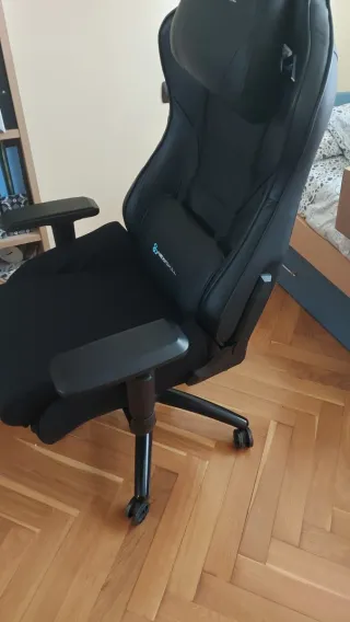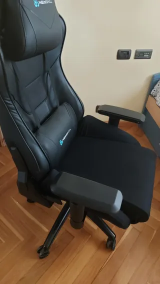 Silla gaming Newskill Kuraokami en muy buen estado. Diseñada para largas sesiones de juego o trabajo. - Tapicería de cuero sintético. - Cojín lumbar y cervical. - Base de 5 ruedas. - Reposabrazos acolchados. El cojín de cuero estaba desgastado y se restauró con tela negra.