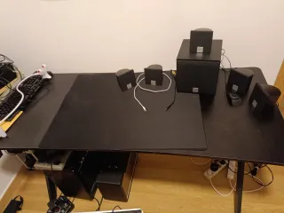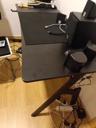 Mesa de escritorio con diseño moderno, ideal para gaming o trabajo. Como nueva, casi sin uso No hago envíos A Coruña - Superficie amplia y resistente. - Estructura metálica en forma de Z. - Acabado en negro con detalles de fibra de carbono.