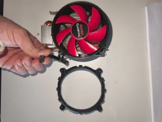 Refrigerador para CPU de la marca Mars Gaming. Incluye ventilador y soporte de montaje. - Ventilador con aspas rojas. - Soporte de montaje negro.