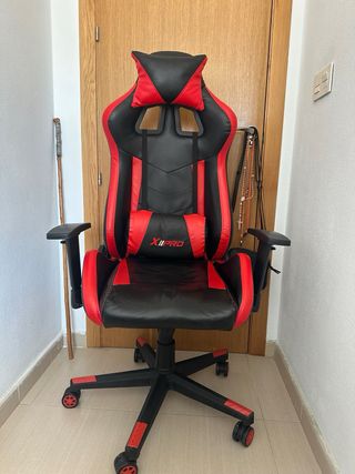 Silla de gaming en color negro y rojo, con un diseño ergonómico. - Tapicería de cuero sintético. - Respaldo alto con soporte lumbar. - Base con ruedas para fácil movilidad.
