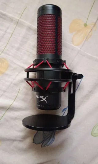 Micrófono HyperX QuadCast en color negro y rojo. Diseñado para streaming y podcasts. - Soporte antivibración integrado. - Cuatro patrones polares seleccionables. - Indicador LED de estado. - Control de ganancia. - Salida de auriculares de 3.5mm.