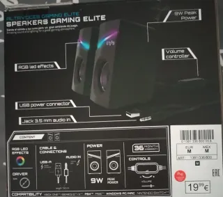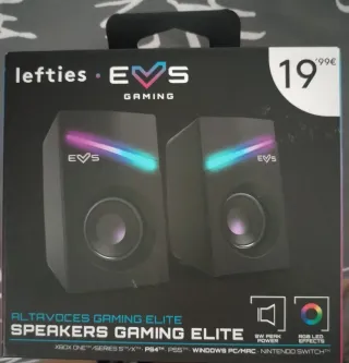Altavoces gaming EVS Elite con iluminación RGB. Se venden por que fue un regalo y tengo unos similares. Solo se han usado dos veces para ver como se escuchaban, están nuevos. - Jack 3.5 mm audio in - Potencia de 9W. - Compatibles con Xbox One, Series S/X, PS4, PS5, PC/Mac y Nintendo Switch. - Efectos de luz LED RGB.