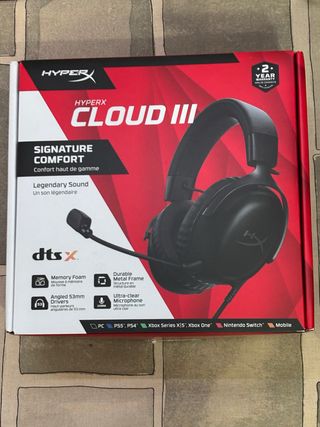 Usados 1 vez para probarlos Nuevos en su caja original Auriculares gaming HyperX Cloud III con diseño de confort y sonido legendario. - Memory Foam. - Drivers angulares de 53 mm. - Marco de metal duradero. - Micrófono ultra claro. - Compatible con PC, PS5, PS4, Xbox Series X|S, Xbox One, Nintendo Switch y móvil.