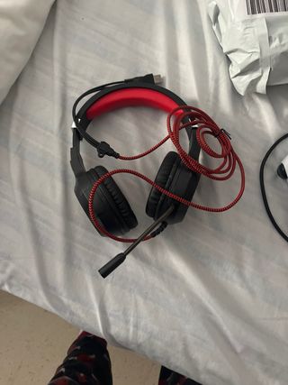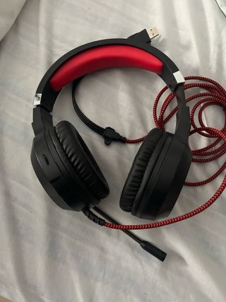 Auriculares gaming con cable y micrófono integrado. Diseñados para una experiencia de juego inmersiva. - Cable trenzado rojo y negro. - Diadema acolchada en rojo. - Micrófono flexible.