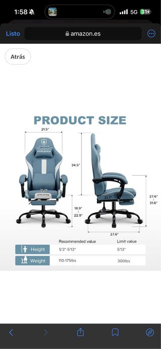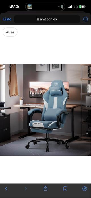 Silla de gaming en color gris, con un diseño ergonómico para largas sesiones. - Respaldo alto con soporte lumbar. - Cojín cervical. - Reposabrazos acolchados. Con fractura de compra de solo unos meses costo 292 euros