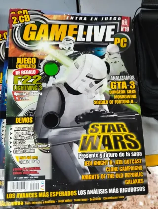 Revista de videojuegos GameLive PC número 19, correspondiente a junio de 2002. Incluye CD con juegos. Tengo 21 revistas todas por 20 euros - Portada temática de Star Wars. - Análisis de GTA 3, Dungeon Siege, Morrowind, Soldier of Fortune II. - Juegos completos de regalo: F22 Lightning 3. - Demos: Jedi Knight II, Dungeon Siege, Sudden Strike 2, F1 2002, Tony Hawk's Pro Skater 3, Stealth Combat. - Mod del mes: Quake III Rally.