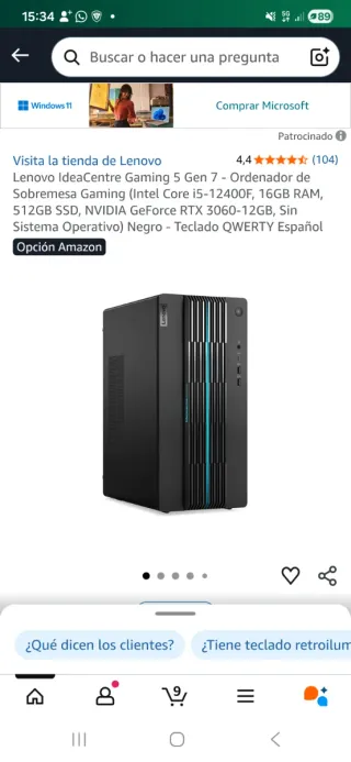 Ordenador de sobremesa gaming Lenovo IdeaCentre. - Modelo: IdeaCentre Gaming 5 Gen 7 - Procesador: Intel Core i5-12400F - Memoria RAM: 16GB - Almacenamiento: 512GB SSD - Tarjeta Gráfica: NVIDIA GeForce RTX 3060-12GB - Sistema Operativo: Windows - Color: Negro - Teclado: QWERTY Español